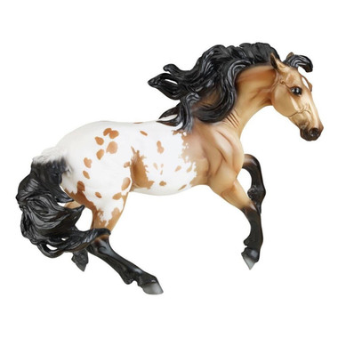 This limited edition Buckskin Appaloosa features a beautifully masked blanket, solid black legs, a two-tone tail, and a shaded face with a star.