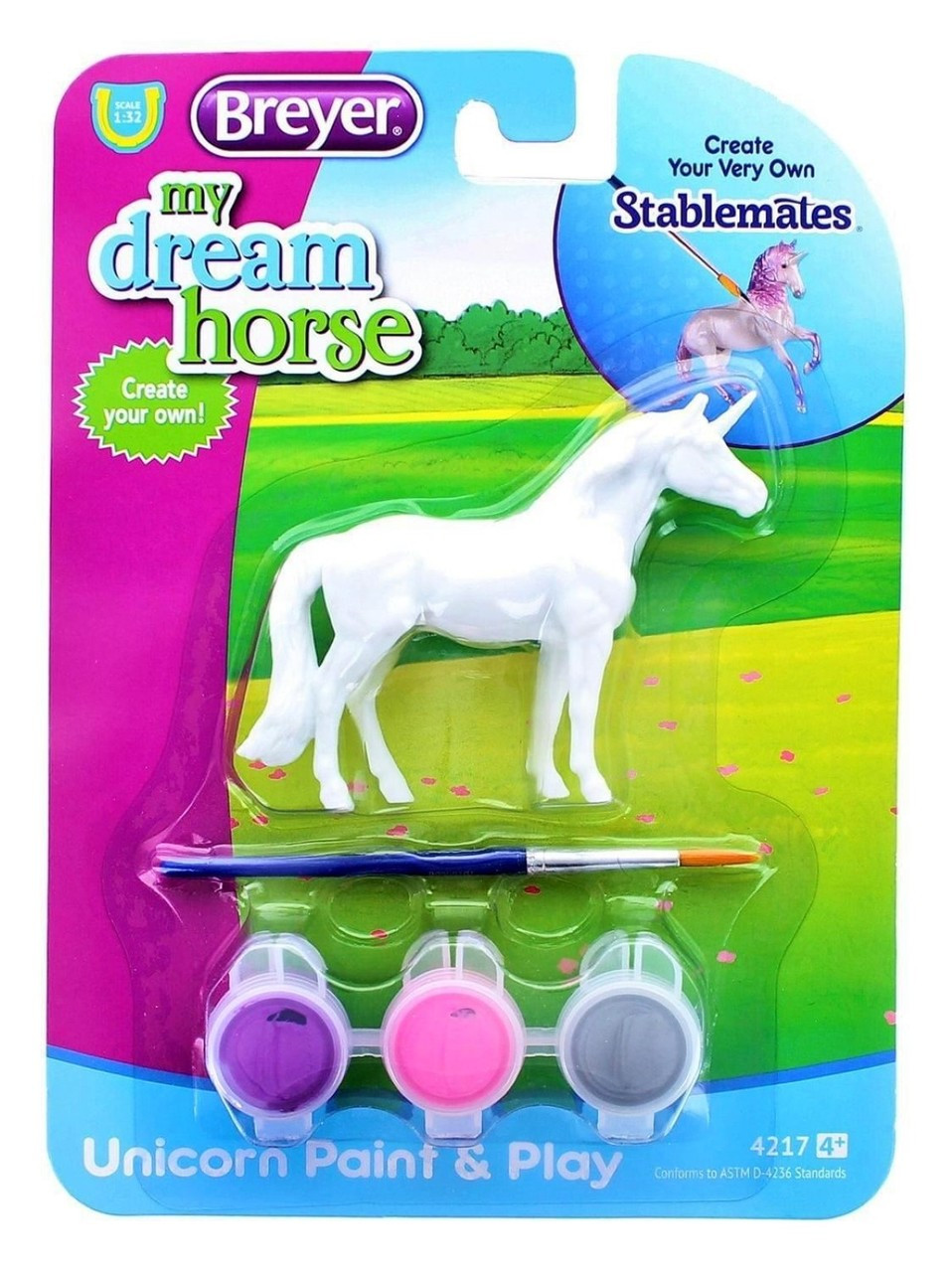 Includes 1 ready-to-paint Stablemates 1:32 unicorn figure, 1 paintbrush and 3 paint pots with iridescent fantasy colors (silver, pink and purple) on a blister card.